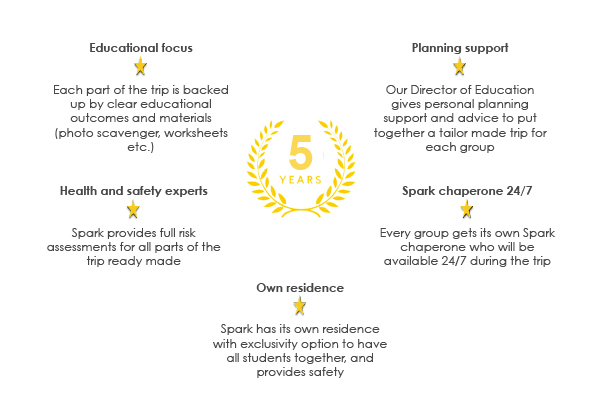 En Spark estamos apasionados por lo que hacemos y creemos en un método personalizado que marque la diferencia, pero aún más importante, hacemos que cada grupo tenga una experiencia inolvidable con nosotros. Nos esforzamos para crear un ambiente acogedor, y profesional con un equipo talentoso que siempre está a la disposición de nuestros grupos para atender a cualquier necesidad personal, educativa y cultural. Valoramos muchísimo las opiniones e informes de mejora para adaptarnos y mejorar nuestros servicios, así nos aseguramos que los grupos tengan un equilibrio perfecto entre el aprendizaje del idioma, la cultura y la interacción social.